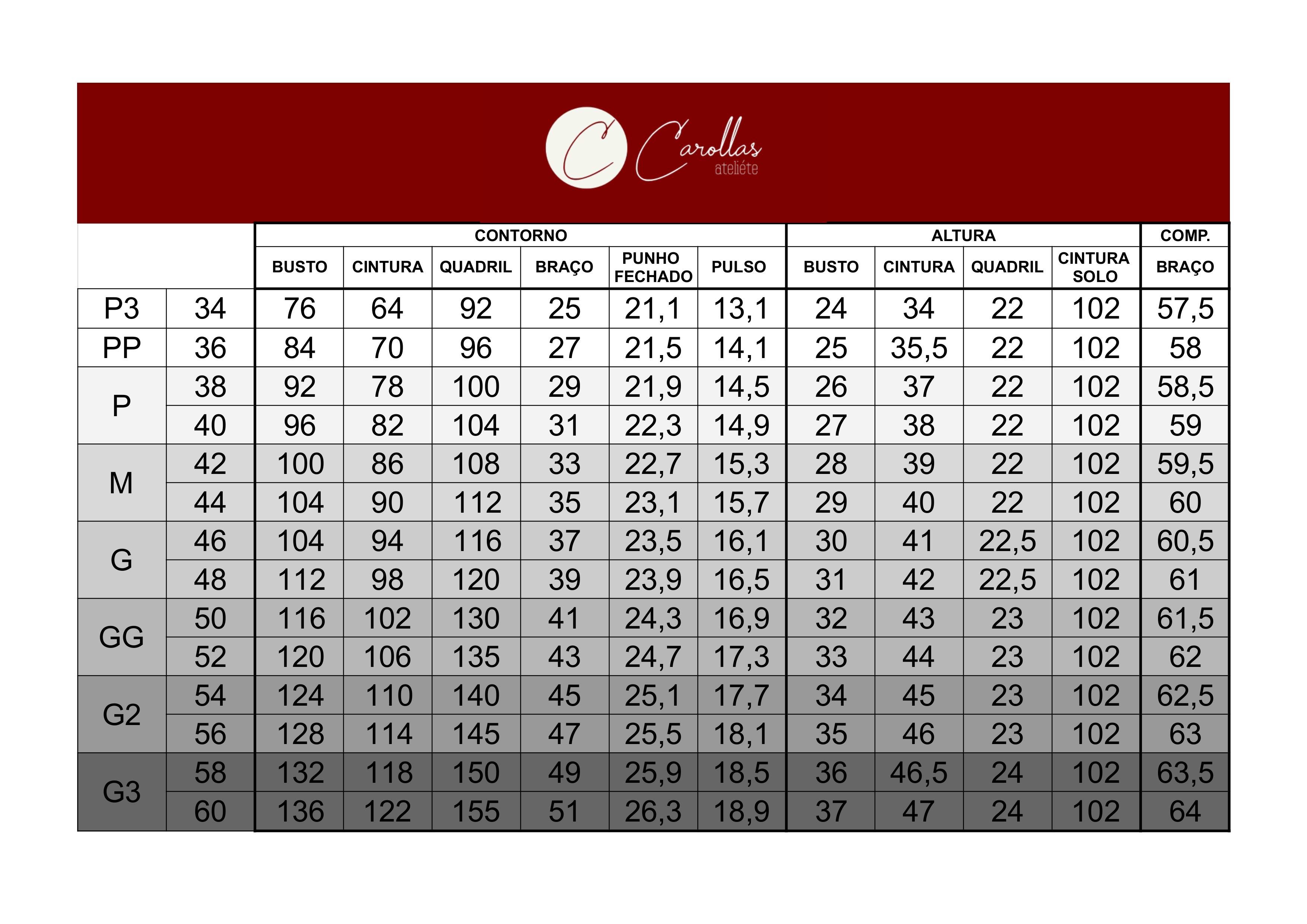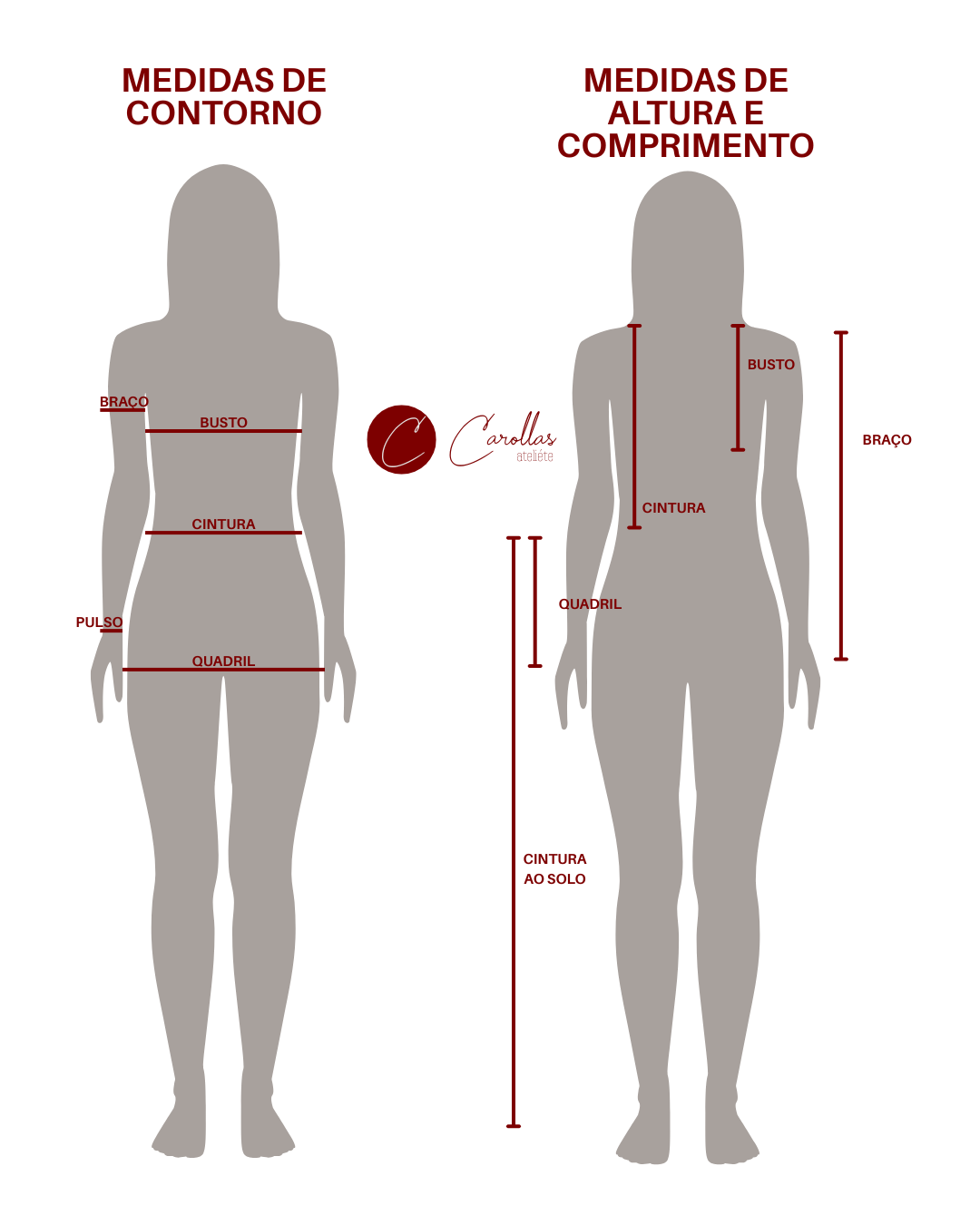Contorno de busto: Medir em volta do tronco passando pela parte mais alta do busto (altura do mamilo) e pelas costas na mesma linha. A fita deve ficar reta e nivelada, sem subir nas costas e sem apertar.